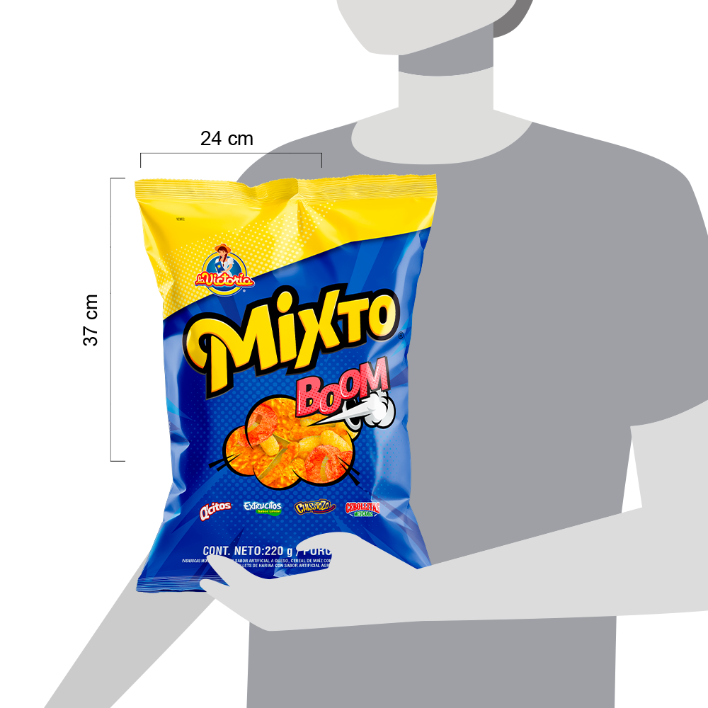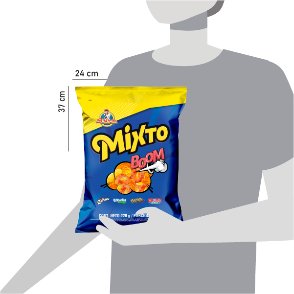 Q´CITOS (maíz, aceite vegetal y sabor artificial a queso [maltodextrina, sólidos de la leche, cebolla en polvo, saborizantes naturales y artificiales, cloruro de potasio (acentuador de sabor), sal yodada, ajo en polvo, queso, glutamato monosódico (acentuador de sabor), azúcar, dextrosa, aceite vegetal, tomate en polvo, inosinato y guanilato disódico (acentuadores de sabor), especias, amarillo N°. 6 y amarillo N°.6 en laca (colorantes artificiales), silicato de calcio y dióxido de silicio (anticompactantes), curcumina (colorante natural), ácido láctico, caramelo clase IV (colorante)], EXTRUCITOS SABOR LIMÓN (cereal de maíz, grasa vegetal y sabor artificial a limón), CHISSTOZO SABOR QUESO (cereal de maíz, grasa vegetal, sabor artificial a queso [suero en polvo, aceite de palma, maltodextrina, sal, sólidos de la leche, sólidos de jarabe de maíz, queso (leche pasteurizada, sal, cultivos lácteos, enzimas), saborizantes naturales y artificiales, acentuador del sabor (glutamato monosódico), colorante natural (cúrcuma), antiaglutinante (dióxido de silicio), colorantes artificiales (amarillo N°.6 (amarillo ocaso FCF), rojo N°.40 (rojo allura AC), amarillo N°.5 (tartrazina)), antioxidante (TBHQ) y acidulante (ácido cítrico)]), CEBOLLITAS (pellets de harina [almidón de maíz, harina de trigo, harina de papa, sal yodada y cebolla en polvo], aceite vegetal y sabor artificial agridulce] y sabor artificial agridulce [azúcar, maltodextrina, sal, almidón de maíz, almidón de yuca, saborizantes naturales y artificiales, especias (chile, tomate, ajo, cebolla), proteína vegetal hidrolizada de soya, aceite vegetal, suero en polvo, acentuadores de sabor (glutamato monosódico, inosinato disódico, guanilato de sodio, cloruro potásico), conservante (diacetato de sodio), acidulante (ácido cítrico), dextrosa, colorantes artificiales (caramelo clase III y IV, amarillo N°. 5 (tartrazina), amarillo N°. 6 (amarillo ocaso FCF), rojo N°.40 (rojo allura AC)), antiaglutinante (dióxido de silicio)]). ALÉRGENOS: Contiene leche y/o derivados, gluten, soya, sulfitos y tartrazina. Puede contener trazas de huevo y mostaza.